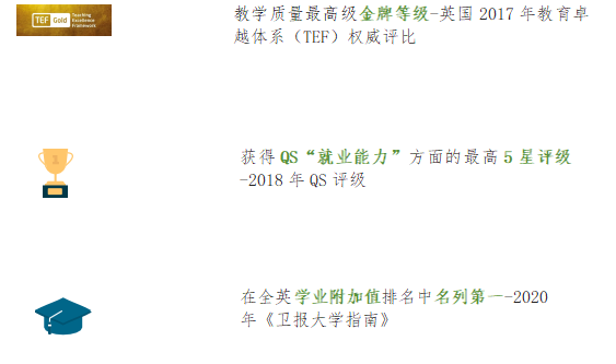 教学优势:在2017年6月发布的最新一期英国官方教学质量评级中,阿斯顿大学获得了教学质量最高级-金牌等级,评级结果标志着阿斯顿大学优质的教学质量,也意味着阿斯顿大学的毕业生能够通过高质量的教学获得职业生涯的高起点或是进一步深造的机会。